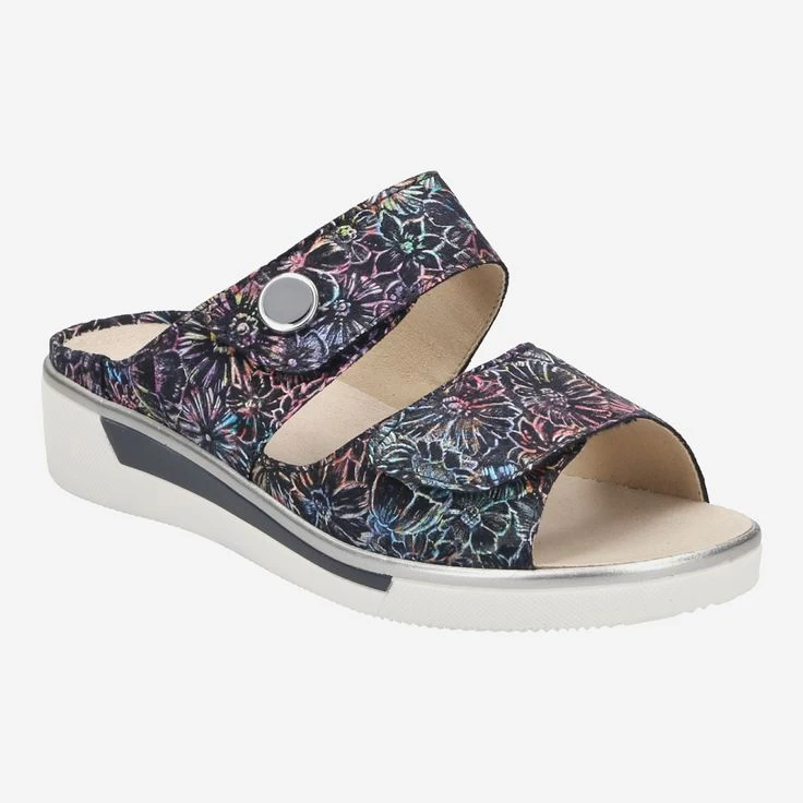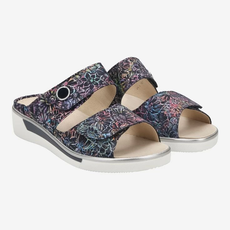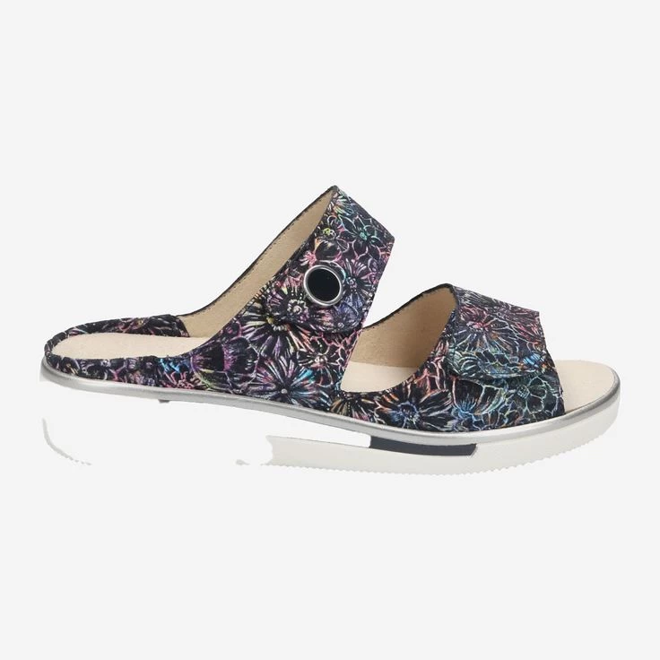 Genießen Sie höchsten Komfort mit dieser bunten Pantolette von ara! Der Wohlfühl-Spezialist stattet diese bequeme Pantolette durch ein austauschbares Fußbett aus, das Ihnen ermöglicht, Ihre persönlichen Einlagen darin zu tragen. Die bedruckten Riemen aus Leder sind durch praktische Klettverschlüsse individuell einstellbar, und schenken Ihnen optimalen Halt und Stabilität.