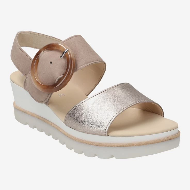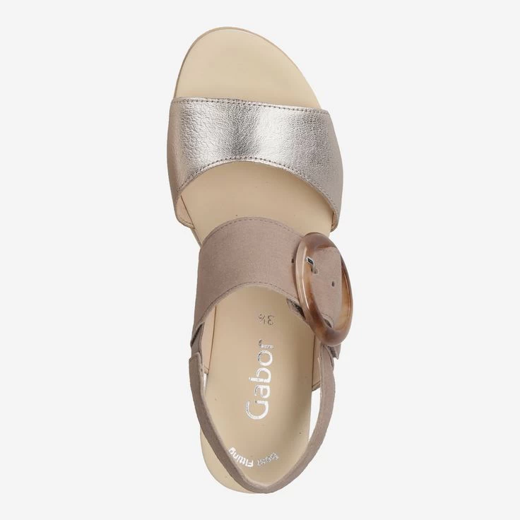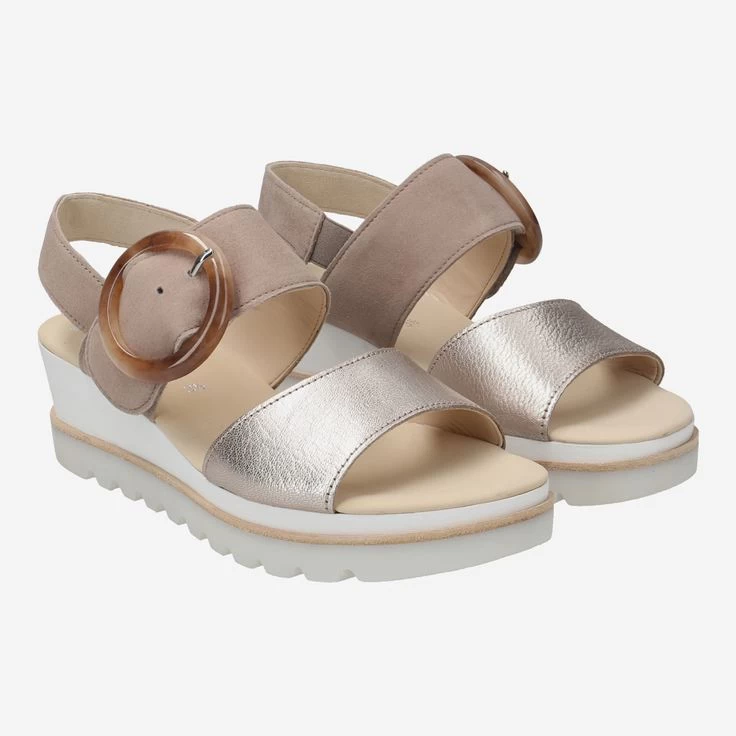 Gabor kombiniert bei dieser bequemen Sandalette beiges Veloursleder mit metallic-beschichtetem Glattleder. Die Farbharmonie setzt sich in der Sohle fort, und macht dieses Modell zu einem harmonischen Allrounder!