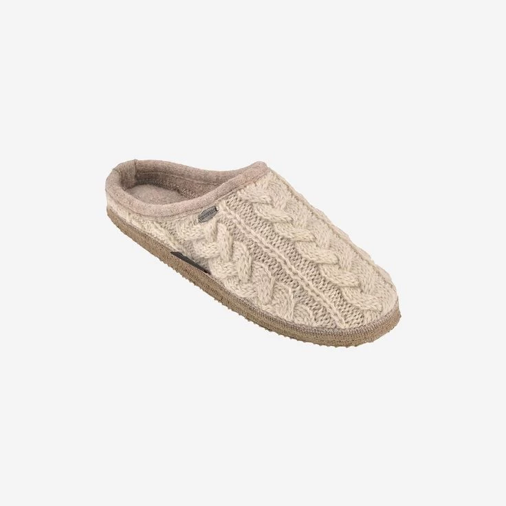 Creme-/Lammfarbene Hausschuhe von Giesswein aus 100% Wolle, Decksohle ebenfalls aus Wolle und einer rutschfeste Laufsohle aus weichem Naturkautschuk. Waschbar bei 30 Grad, ohne Weichspüler und Trockner. Für Wechselfußbett geeignet.