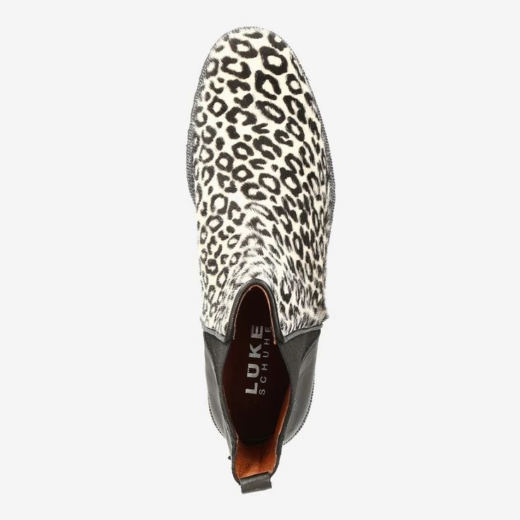 Dieser Chelsea Boot von Schuhe Lüke ist ein modischer Hingucker. Die Kappe aus Ponyfell mit Leo-Print-Motiv ist ein schöner Kontrast zur Ferse aus genarbtem Leder. Diese Stiefelette lässt sich wunderbar zu Hosen jeder Art kombinieren.